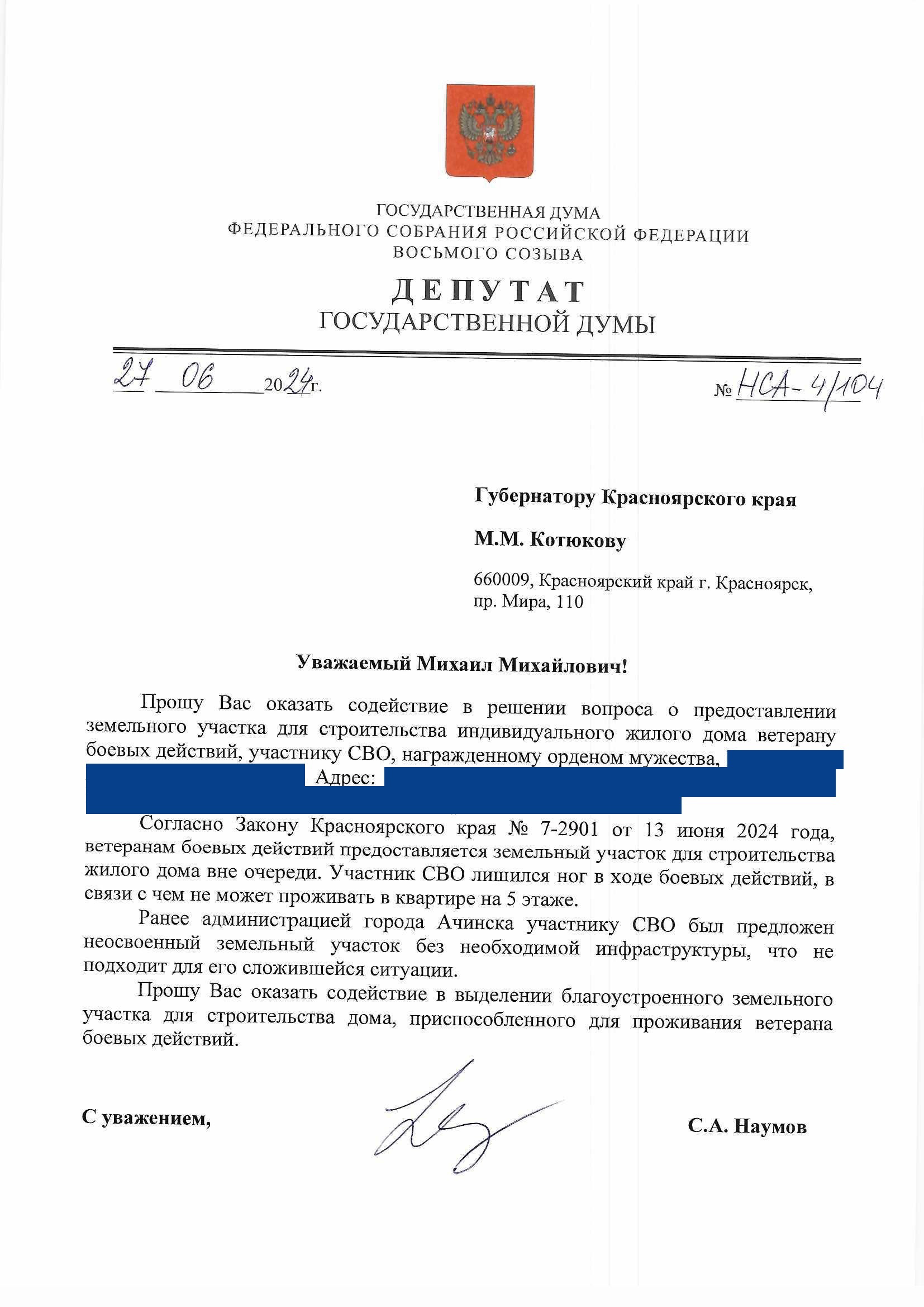 «Закон приняли 13 июня 2024 года в Законодательном собрании. Он уже вступил в законную силу, а всем муниципалитетам дали отмашку готовиться и искать подходящие земельные участки. Ачинск, как всегда, отличился. Земельных участков и таких реестров для нужд участников СВО нет. На сегодняшний день ещё никто ничего другого матери героя СВО не предложил, поэтому я обратился к старшему коллеге, депутату Государственной думы Станиславу Наумову, который в свою очередь сделал запрос на имя губернатора Красноярского края», — рассказал Дмитрий Куликов.