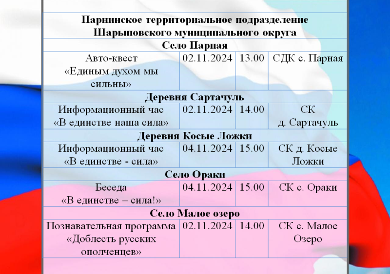 4 ноября вся Россия отмечает государственный праздник День народного единства. Этот день символизирует единство всех народов, проживающих на территории страны. В 2023 году в связи с этой датой, на территории Шарыповского муниципального округа пройдут различные мероприятия, которые помогут людям лучше понять значение этого праздника и его историческую ценность.