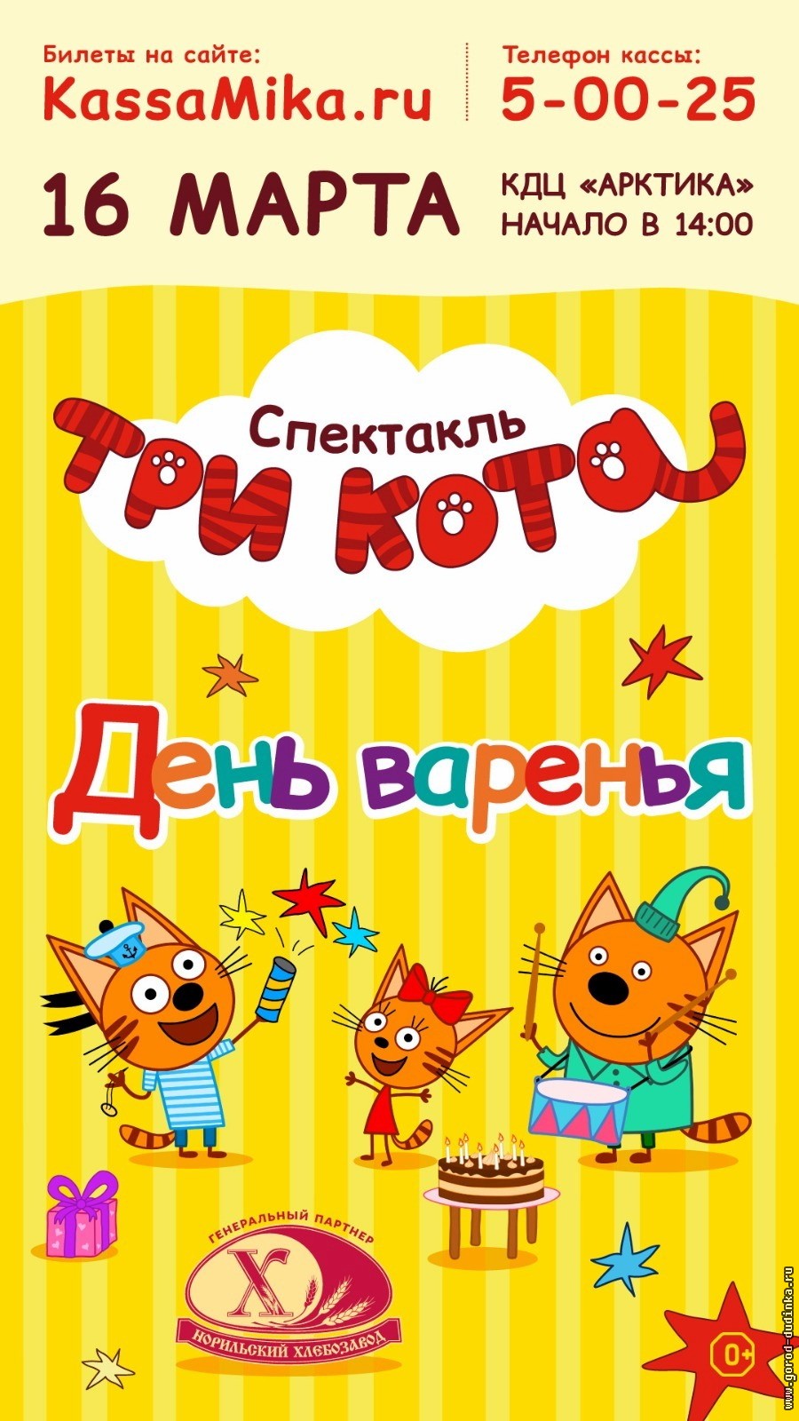 16 марта в 14:00 кинодосуговый центр «Арктика» приглашает детей и их родителей на спектакль «Три кота: День варенья!».