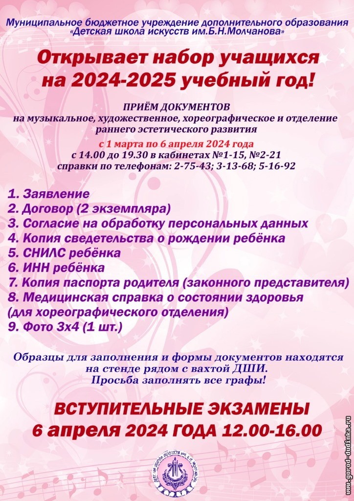Детская школа искусств имени Б. Н. Молчанова объявляет набор учащихся на 2024-2025 учебный год.