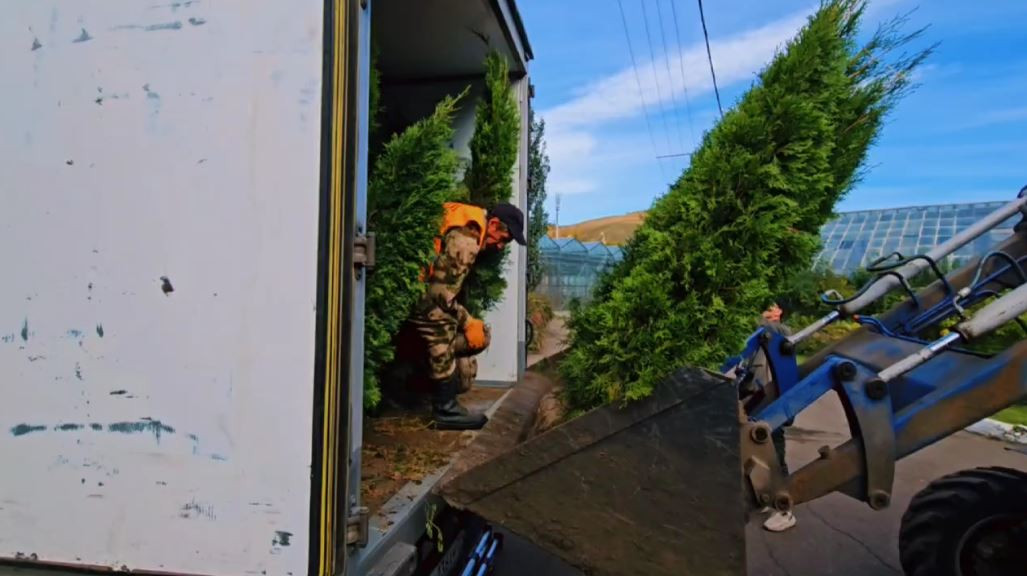 Работники муниципального предприятия "Управление зелёного строительства" сейчас разгружают партию. Пальмы и туи отправятся в теплицы, где специалисты в течение 2 недель будут внимательно следить за их состоянием. Потом растения пересадят в особую почву и оставят до весны.