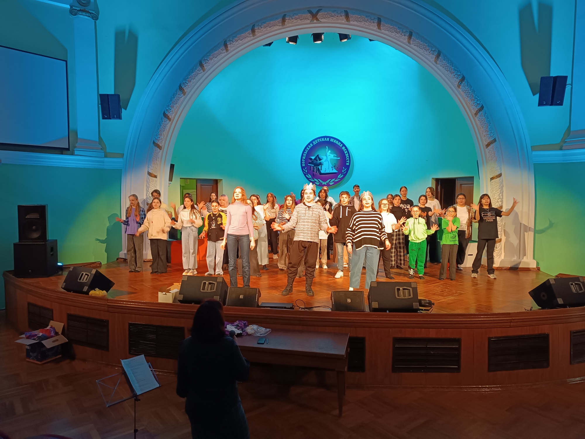 Было проработано все: выходы в такт музыке, передвижения кубиков, назначили даже ответственных за части декораций. Попадая в закулисье (самое любимое место всех актеров НДШИ), случайный человек мог бы подумать, что там полный беспорядок, но это не так, везде разложены реквизиты для следующих персонажей, а после выступления каждый обязательно вешает свой костюм и раскладывает воротнички, юбки, шапочки – у кого какая роль. Особо трепетное отношение ребят вызывает тот факт, что костюмы были пошиты Еленой Юрьевной лично.