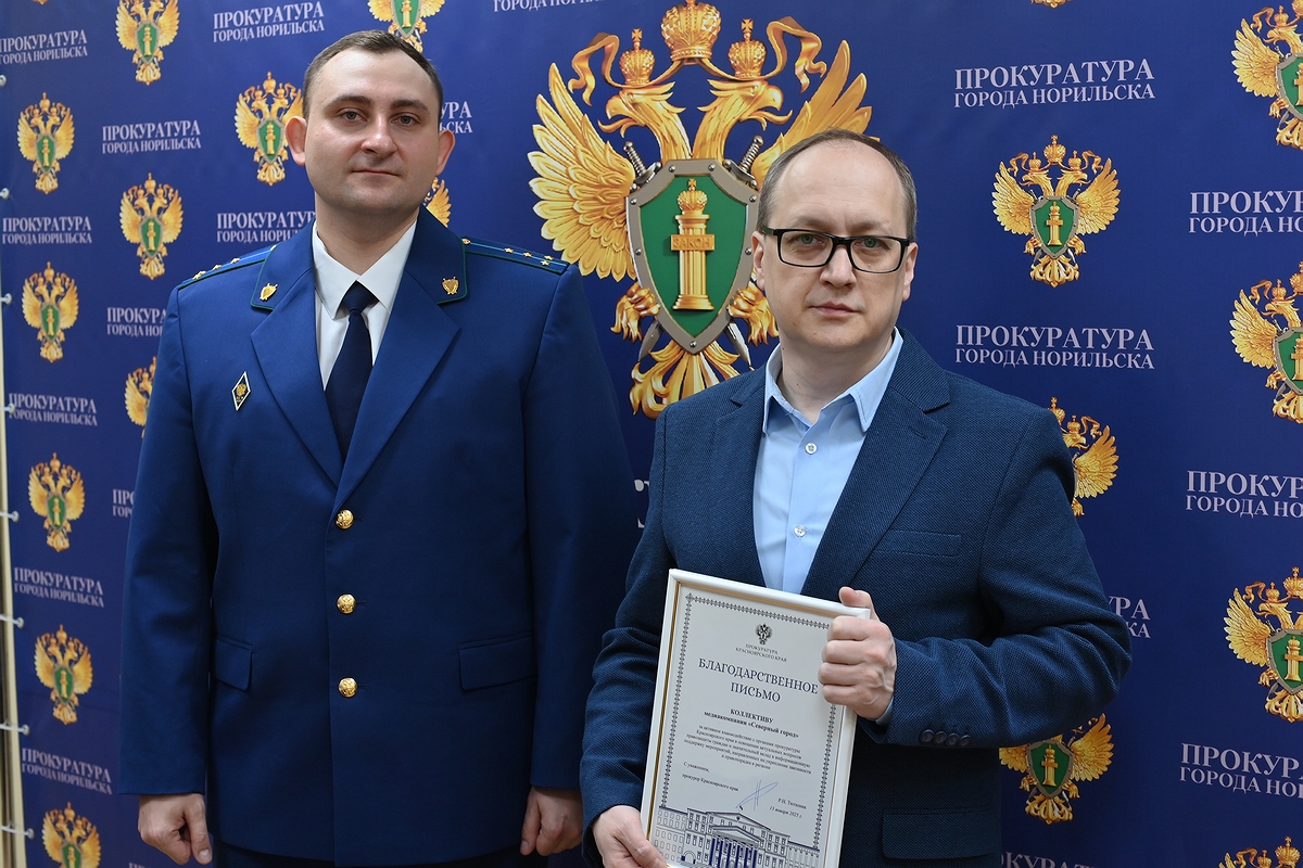 Благодарственное письмо от краевой прокуратуры коллективу медиакомпании «Северный город» получил Ален Бурнашев, главный редактор телекомпании. По поручению прокурора города Норильска Андрея Леймана награду вручал заместитель прокурора Норильска Александр Жуков.