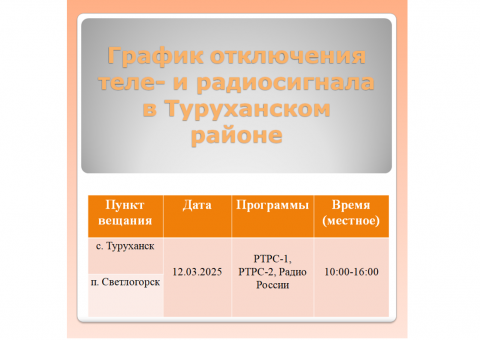 По данным специалистов филиала РТРС «Красноярский КРТПЦ» профилактика запланирована 12 марта, в период с 10:00 до 16:00 часов местного времени. В этот промежуток времени возможны кратковременные остановки трансляции 20 цифровых эфирных телеканалов, а также Радио России.
